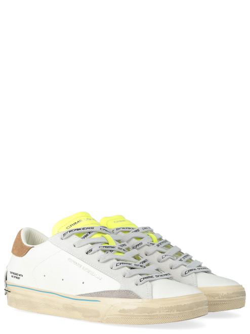 Sneaker Crime London Distressed 2.0 aus weißem Leder. Mit weißer Lederzunge und Fersenkappe aus hellgrauem Wildleder mit Logo. Mit grauem Wildlederdetail, weißem Lederaufnäher auf der Rückseite und Futter aus Leder und Stoff.