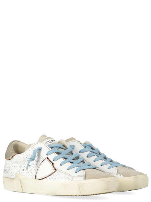 Sneaker Philippe Model Prsx aus beigem Leder. Mit perforiertem Obermaterial, einer Fersenkappe aus rotem Leder mit Crackle-Effekt und einem schwarzen Emblem an der Seite. Mit grauer Zunge aus Wildleder und Ferse mit Krokodilprägung.
