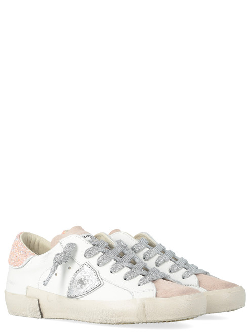 Sneaker Philippe Model Prsx aus weißem Leder. Mit goldglitzernder Fersenkappe und silbernem Emblem an der Seite. Mit silbernen Schnürsenkeln und blauer Zunge aus Wildleder.